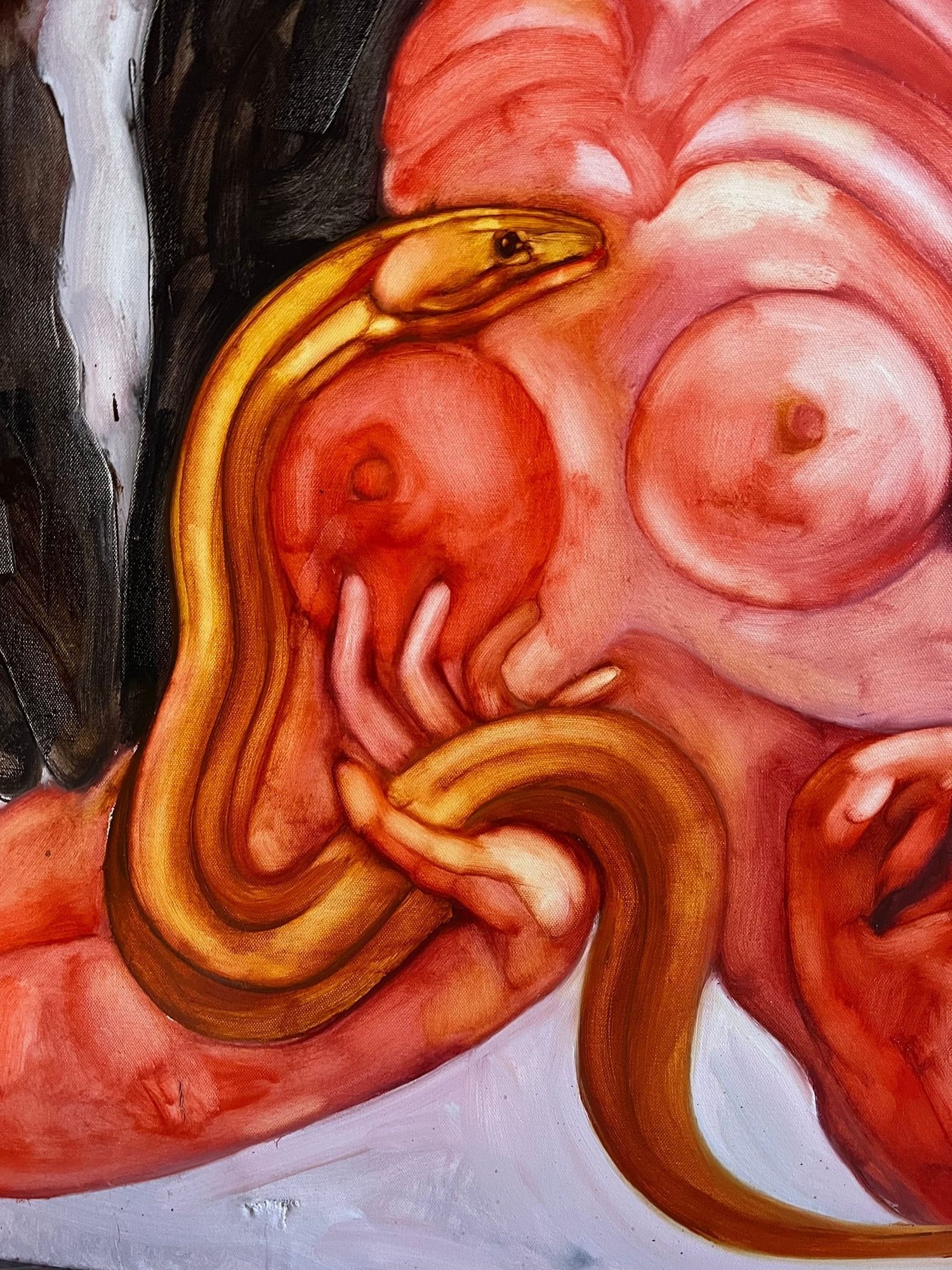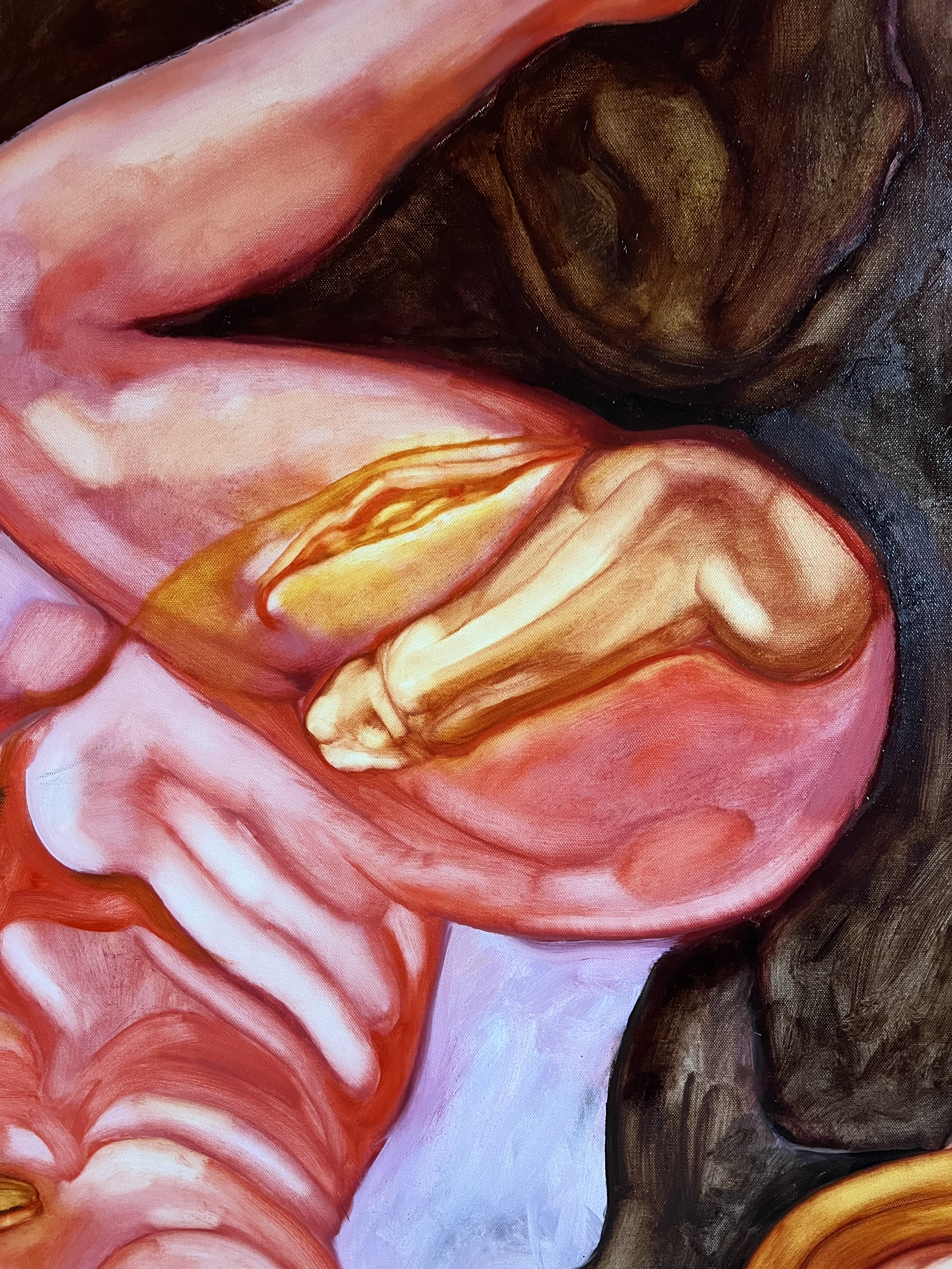 Her name is formed from πᾶσι, “to all, everywhere”, and ˊφᾶος “light, radiance”. The painting takes this etymology literally; this is not a private scene of deviance, but a study in universal light passing through the fluids of a particular body, its mucus and blood, rather than through reason and law. Before the moral economy of the heroic age of revelation and punishment, I had already worked on a cycle about the liberation of Prometheus and the perversion of the myth, several canvases exploring methods of release through the severing of limbs, the absorption of the vulture, the reduction of the hero to a dish for his own liver. Here the key is simpler and more radical, a movement outside the paradigm of law by means of natural form, by means of feminine emanation.